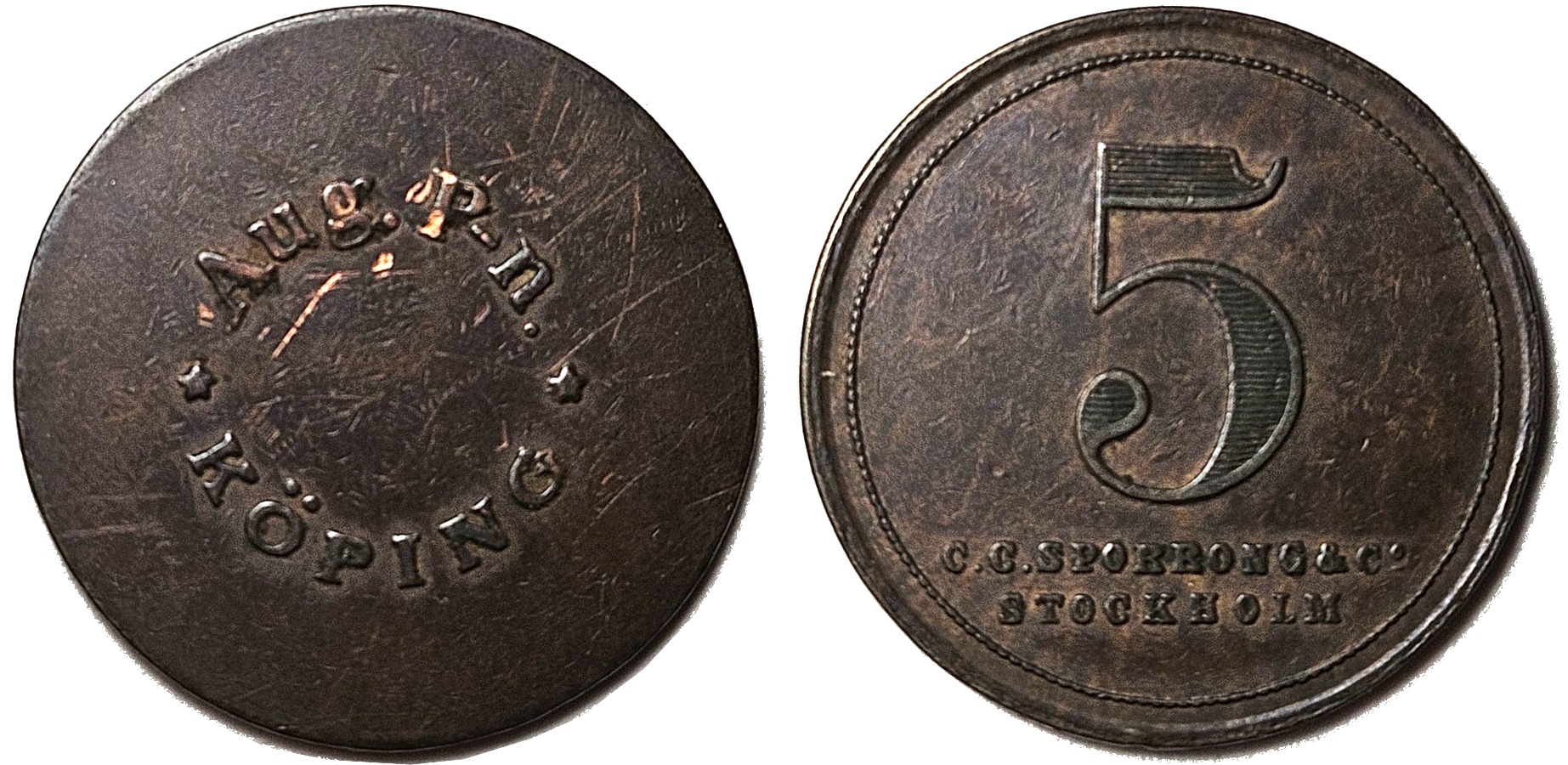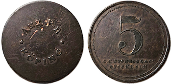 Aug. P-n KÖPING )( 5 SpRs. 29 mm. Koppar. Ex. J Pedersen Mynthandel: Lagerkatalog Polletter År 2025. Nr