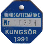 HUNDSKATTEMÄRKE Nr 00324 KUNGSÖR 1991. Blå.