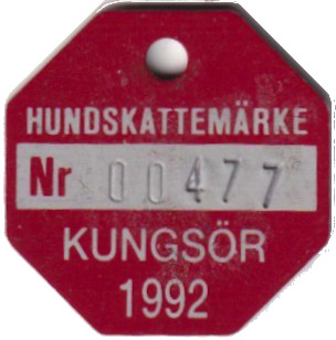 HUNDSKATTEMÄRKE Nr 00477 KUNGSÖR 1992. Röd.