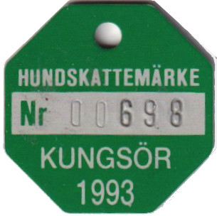 HUNDSKATTEMÄRKE Nr 00698 KUNGSÖR 1993. Grön.