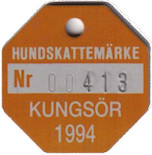 HUNDSKATTEMÄRKE Nr 00413 KUNGSÖR 1994. Gul.