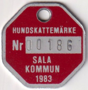 HUNDSKATTEMÄRKE Nr 00186 SALA KOMMUN 1983. Röd.