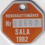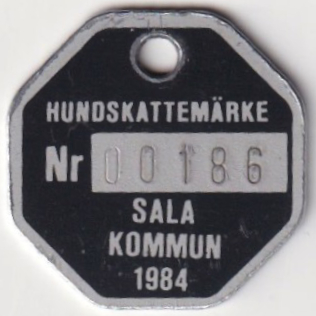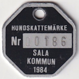 HUNDSKATTEMÄRKE Nr 00186 SALA KOMMUN 1984. Svart.