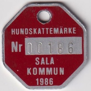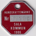 HUNDSKATTEMÄRKE Nr 00186 SALA KOMMUN 1986. Röd.