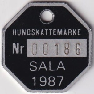 HUNDSKATTEMÄRKE Nr 00186 SALA 1987. Svart.