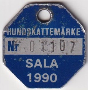 HUNDSKATTEMÄRKE Nr 01107 SALA 1990. Blå.