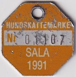HUNDSKATTEMÄRKE Nr 01107 SALA 1991. Orange.