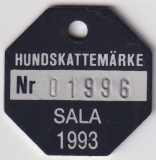 HUNDSKATTEMÄRKE Nr 01996 SALA 1993. Svart.