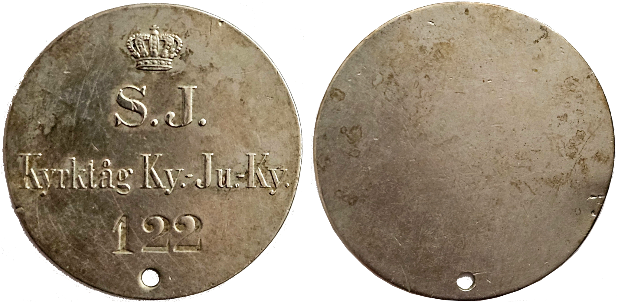 Krönt S.J. Kyrktåg Ky. Ju. Ky 122 42 mm. Vitmetall.