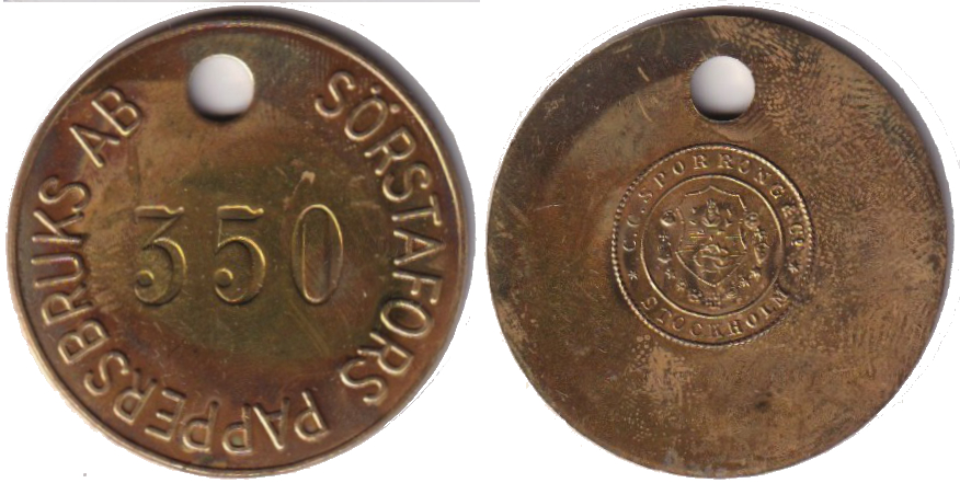 SÖRSTAFORS PAPPERSBRUK )( SpSn. Rund med hål upptill. Mässing.
